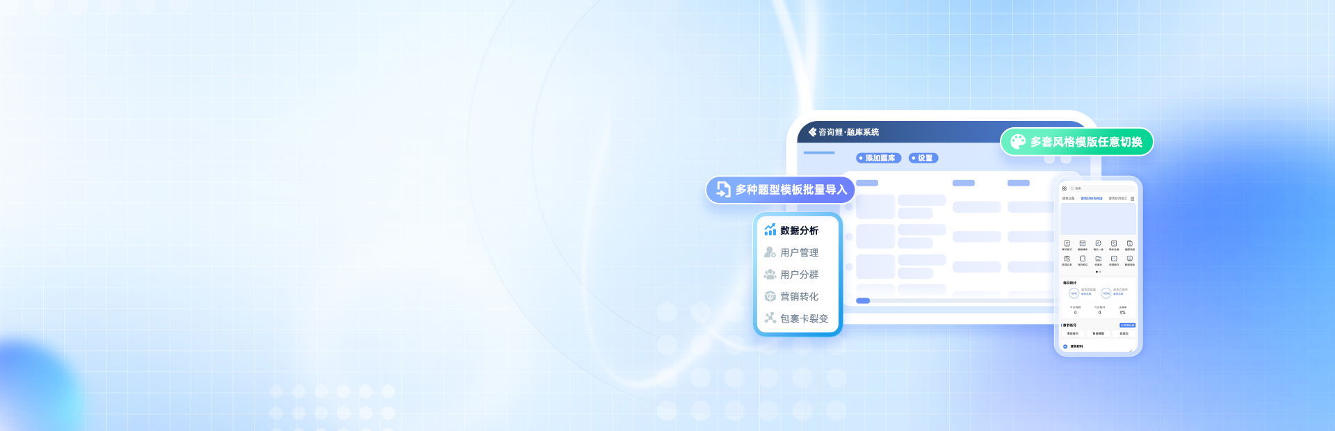 支持批量导题与多维题库管理,覆盖多模式刷题、智能组卷、错题归集,搭配答题统计分析,满足备考刷题与教学组卷核心需求
