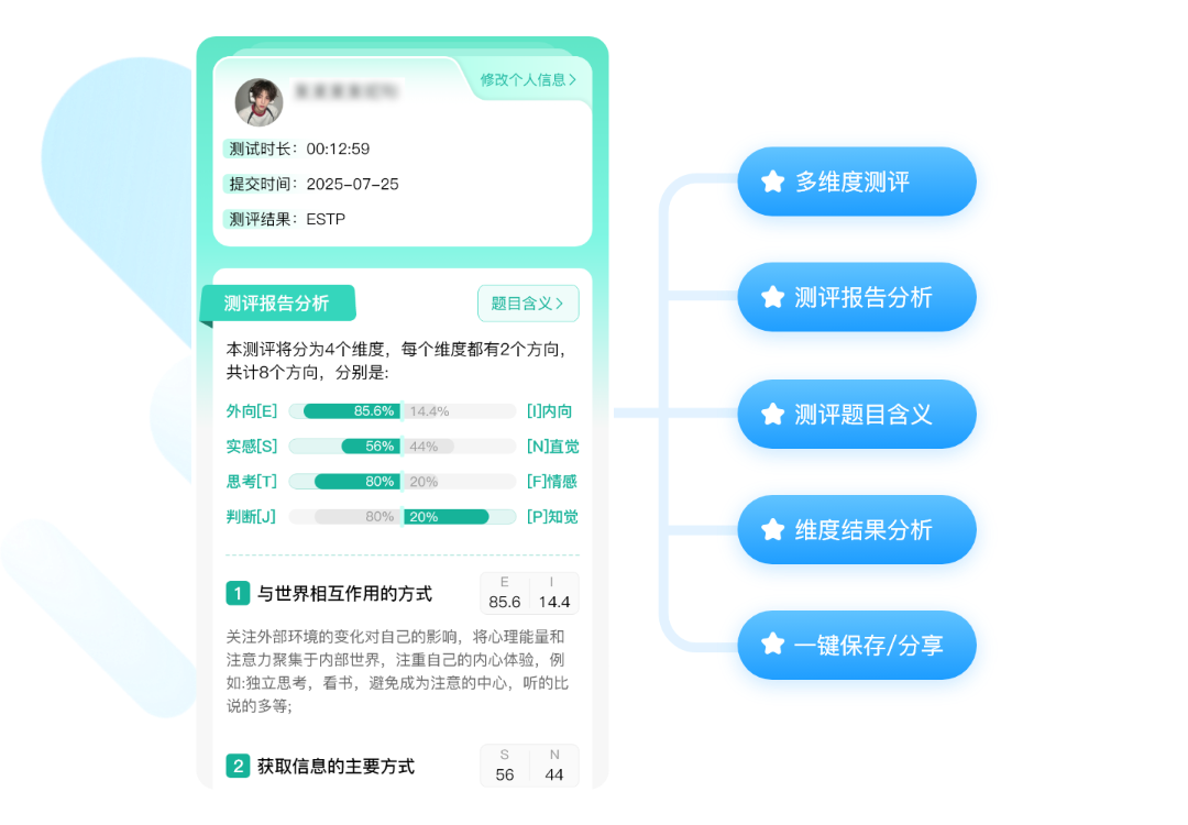 支持知识 / 能力 / 性格测评,自定义题目与评分规则
