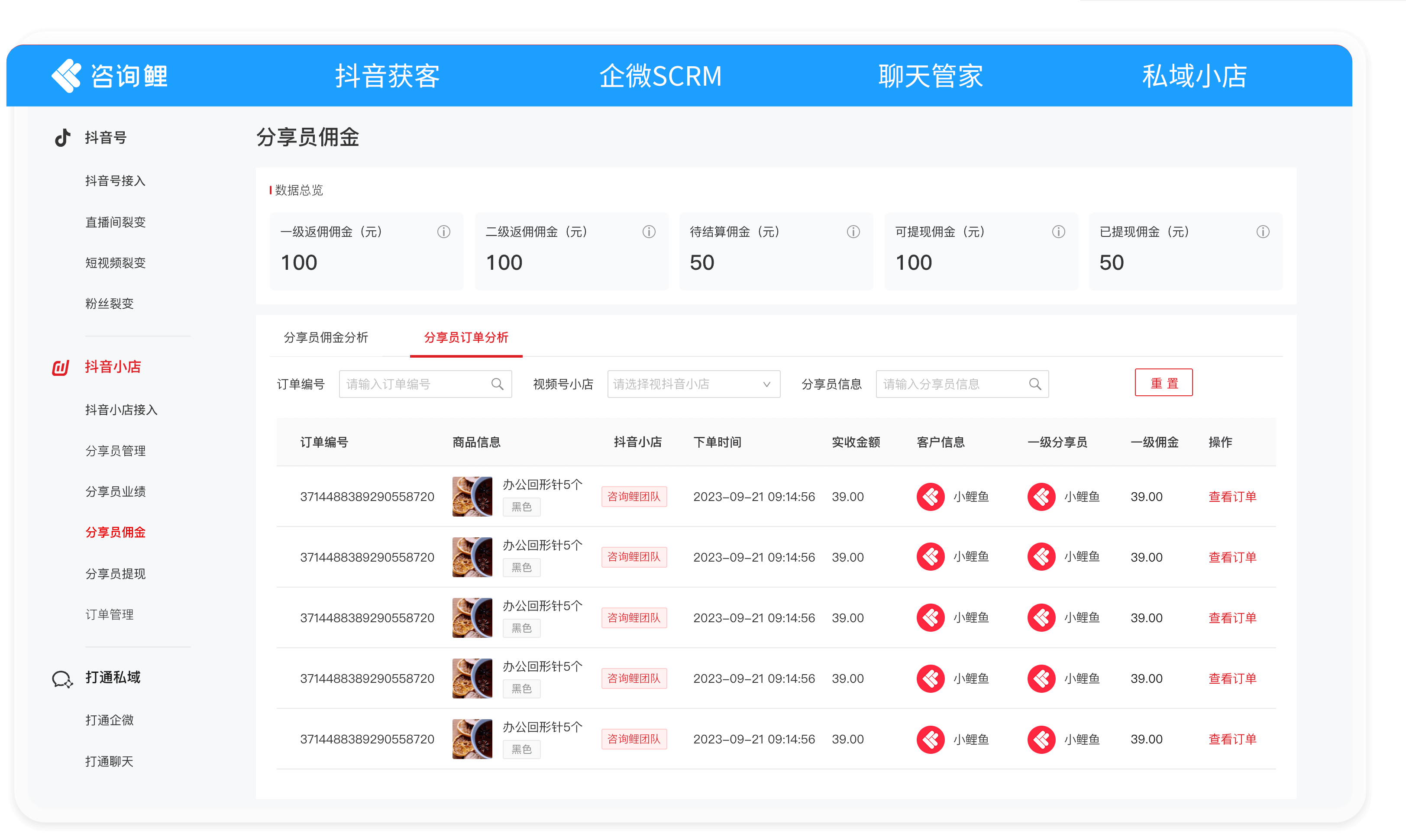 基于佣金规则核算分享员佣金,可查看佣金金额、返现状态