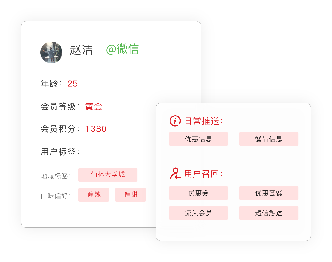 客户信息一目了然,分析客户行为习惯,根据客户口味、就餐位置偏好,推荐合适的餐品和门店优惠信息